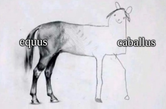 - caballus ↔ equus is like "piss" ↔ "go to bathroom"